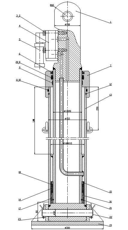 液壓支柱由1活柱、2螺栓、3彈墊、4液控單向閥、5安全閥、6防塵圈、7柱帽、8蕾形密封圈、9活塞桿導(dǎo)向環(huán)、10  O形圈、11擋圈、12(21)連接鋼絲、13油缸、14鼓形密封圈、15活塞擋圈、16下?lián)跞Α?7活塞導(dǎo)向環(huán)、18支撐環(huán)LW形、19底座、20蕾形圈用擋圈、22銷軸、23開口銷等零部件組成。(圖一)