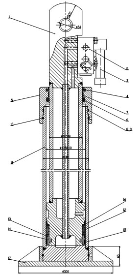 液壓支柱由1活柱、2液控單向閥、3安全閥、4防塵圈、5柱帽、6蕾形密封圈、7活塞桿導(dǎo)向環(huán)、8  O形圈、9  O形圈用擋圈、10連接鋼絲、11油缸、12鼓形密封圈、13活塞擋圈、14外卡鍵、15活塞導(dǎo)向環(huán)、16LW形支撐環(huán)、17底座零部件組成。